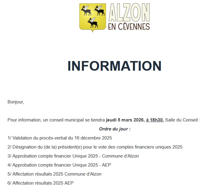 Conseil Municipal Le prochain Conseil Municipal se tiendra le jeudi 05 mars 2026, à 18h30, salle du Conseil. Jacques Oerlemans2026-03-03T18:59:06+01:00mars 3rd, 2026|