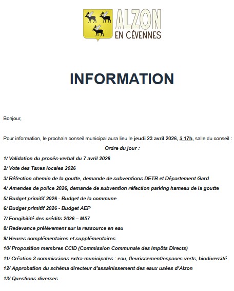 Conseil Municipal Le prochain Conseil Municipal se tiendra le jeudi 23 avril 2026, à 17h00, salle du Conseil. Jacques Oerlemans2026-04-21T08:32:37+02:00avril 21st, 2026|